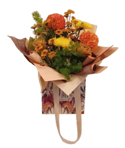 A radiant arrangement of yellow, orange, and golden flowers wrapped in soft beige and bronze paper. Presented in a decorative floral bag, this cheerful bouquet brings warmth and joy — perfect for brightening any day or celebrating happy occasions.